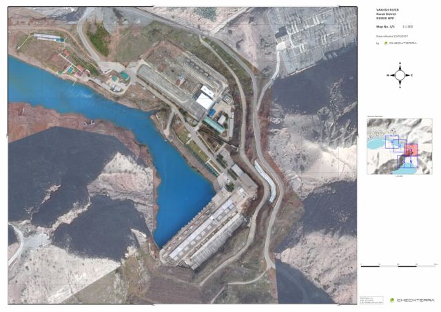Задача заключалась в том, чтобы сфотографировать всю необходимую территорию на реке Вахш. В общей сложности речь шла о фотографировании местоположения плотины 2 км2 (около 200 га) и замер 40+ батиметрических профилей. Результатом стала подробный ортофотоплан и ЦММ (цифровая модель местности) окружающих берегов, включая контуры.